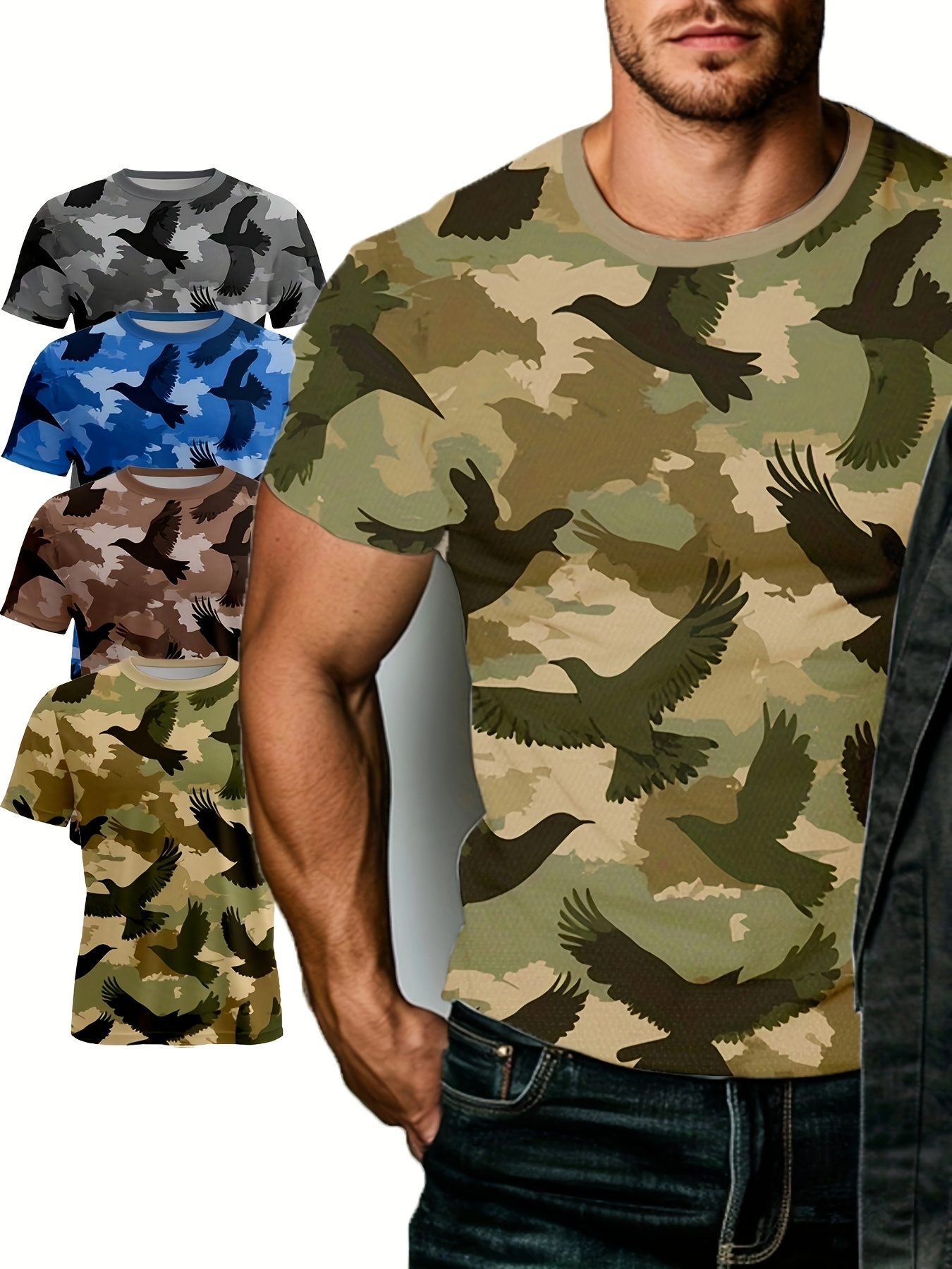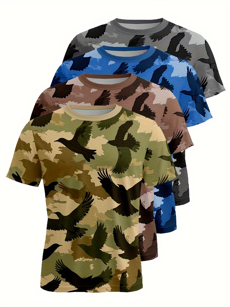 4pcs Men'S Camo Tactical T-Shirts - Breathable Polyester, Crew Neck, Short Sleeve, Casual Sports Knit Fabric, Slight Stretch, Regular Fit for Spring/Summer Outdoor Activities, PLUS SIZE