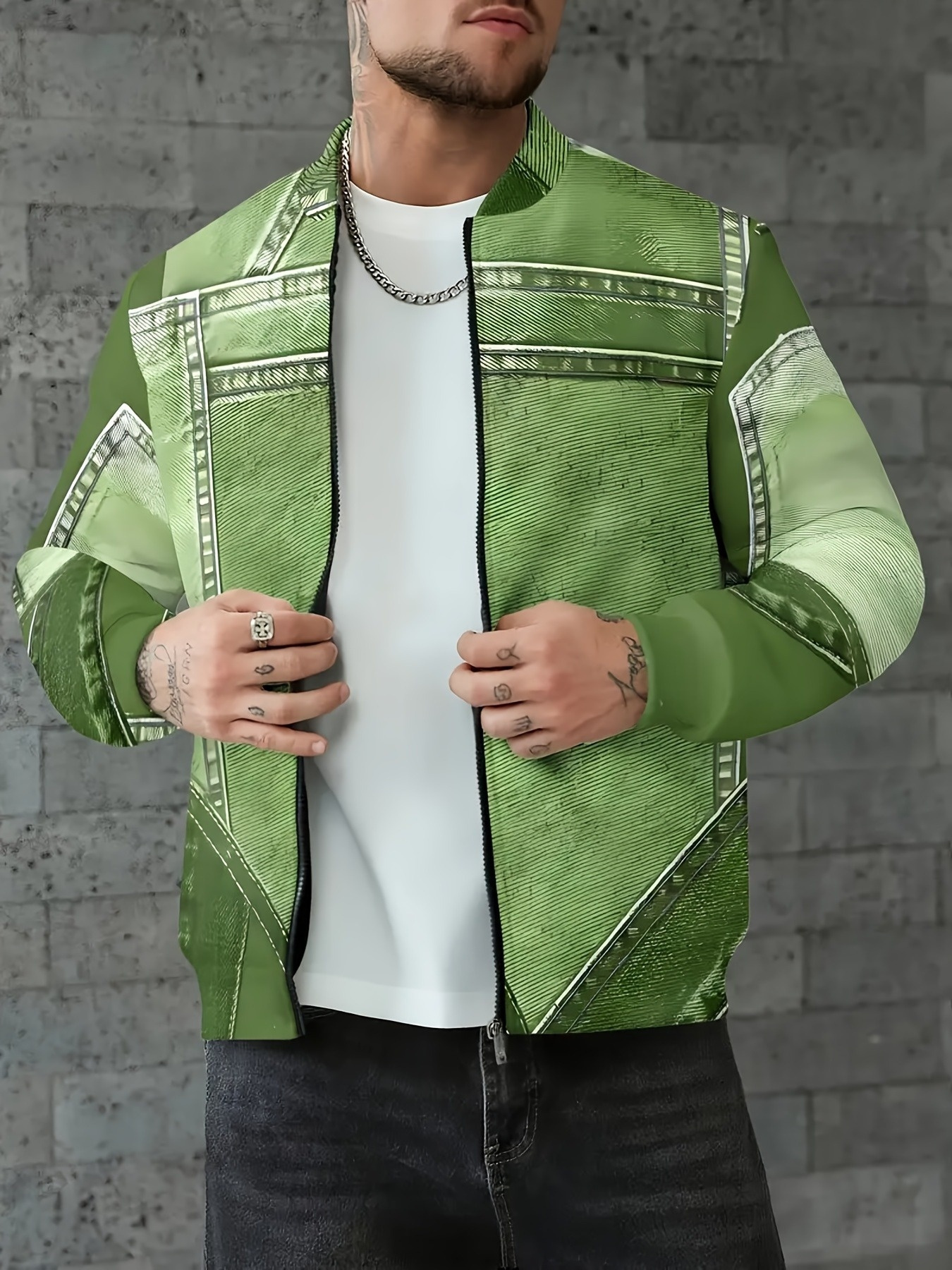 Men'S Oversized 3D Faux Denim Jacket with Full-Zip Closure, Stand Collar & Practical Pockets - Machine Washable Casual Bomber Coat for Autumn/Winter, Plus Size