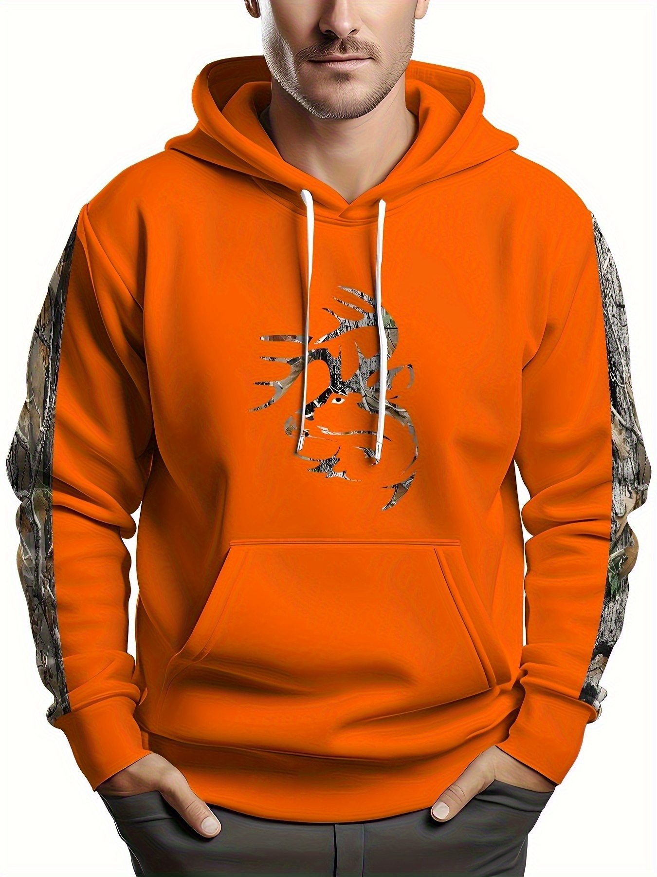 Men'S Plus Size Stretch Polyester Blend Hoodie - 3D Deer Pattern Bright Orange, Kangaroo Pocket Long Sleeve Pullover Suitable for Autumn and Winter, Machine Washable Casual Sportswear, Bold Animal Print, Comfortable Fit, Plus Size