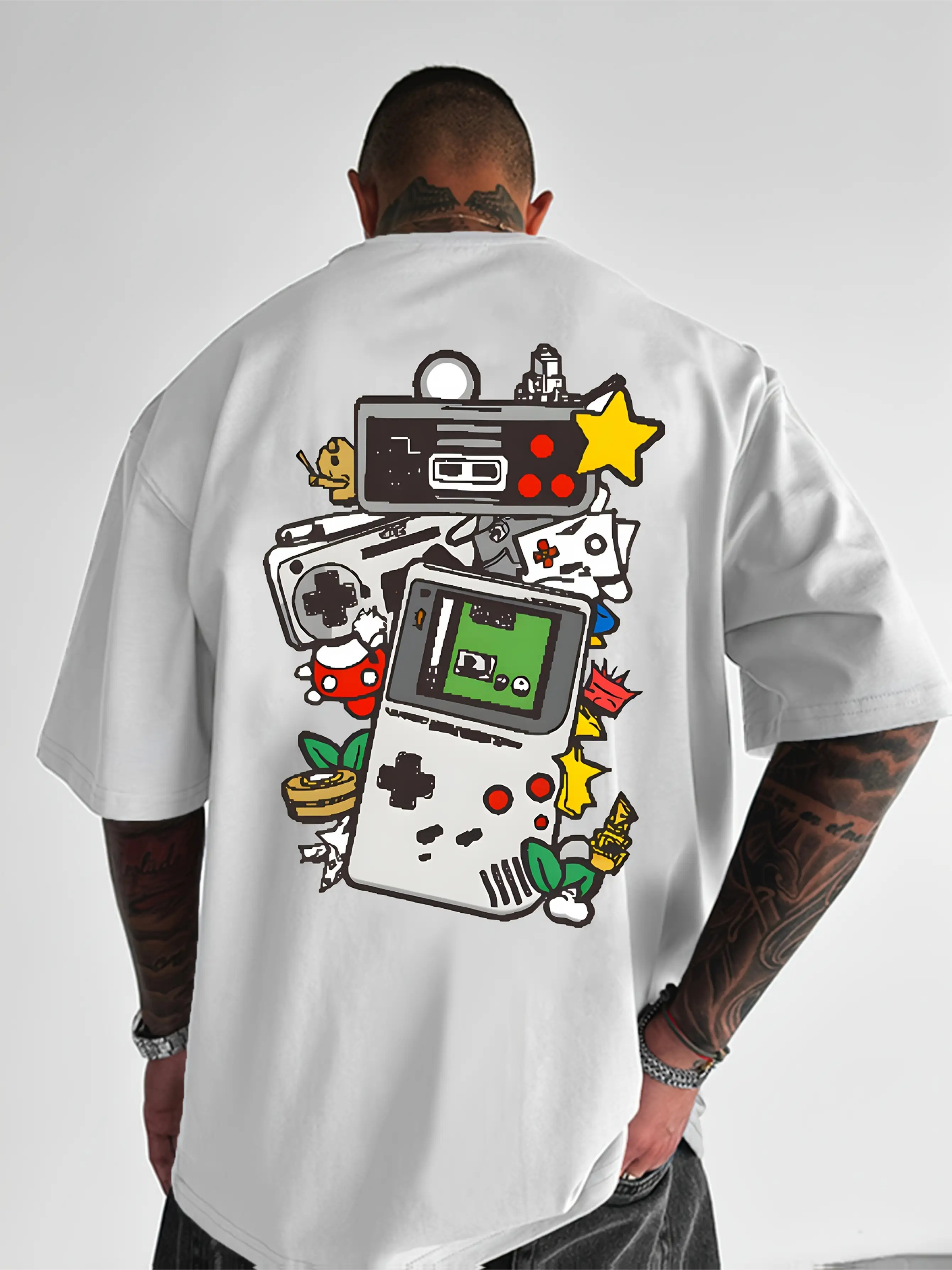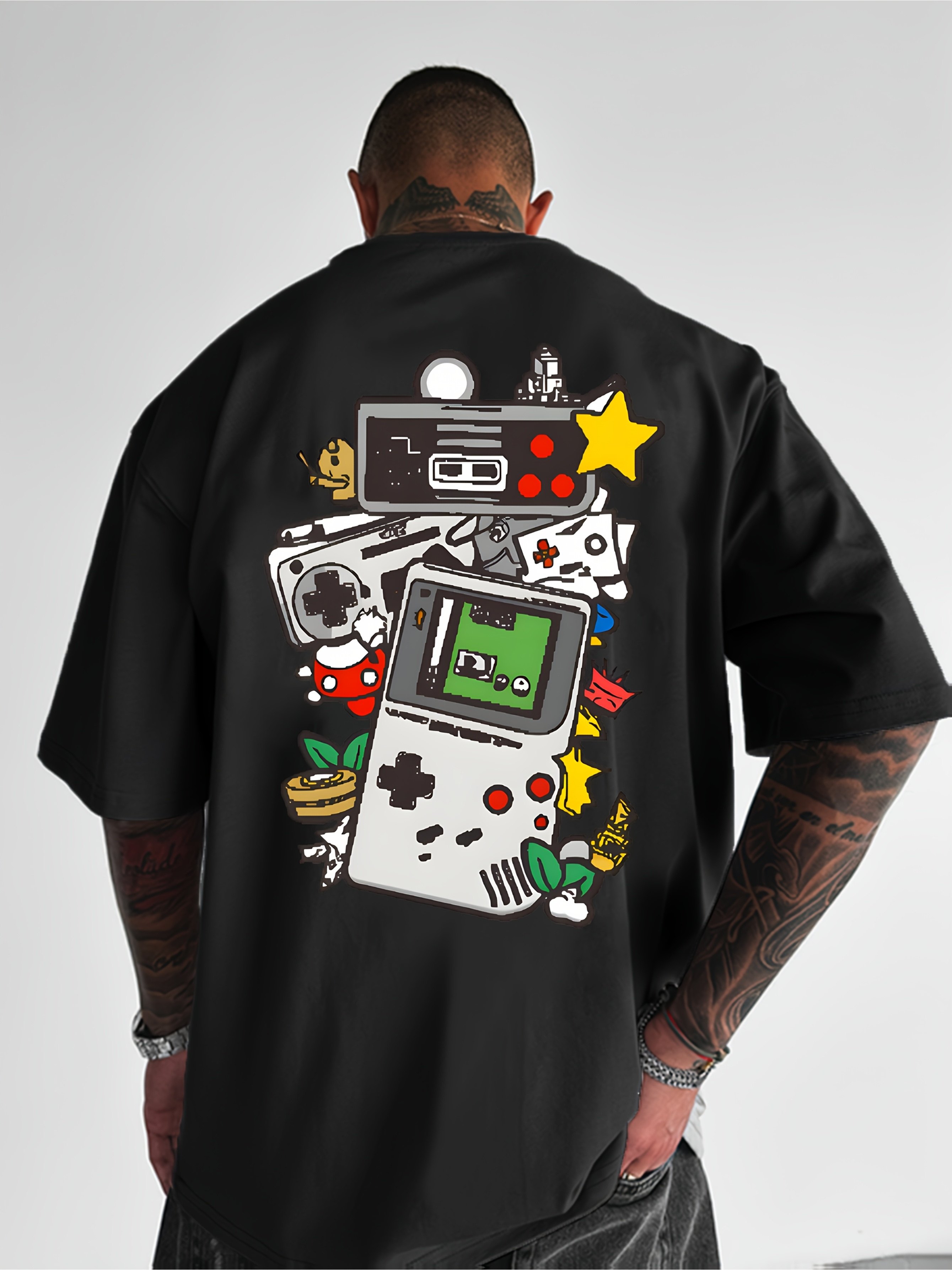 Men's Retro Gaming T-Shirt - 80s/90s Nostalgia Video Game Controllers & Mario//Donkey Print - Lightweight Breathable Short Sleeve Tee for Casual Summer Wear, Gaming Events & Parties (Retro Gamer Outfit), PLUS SIZE