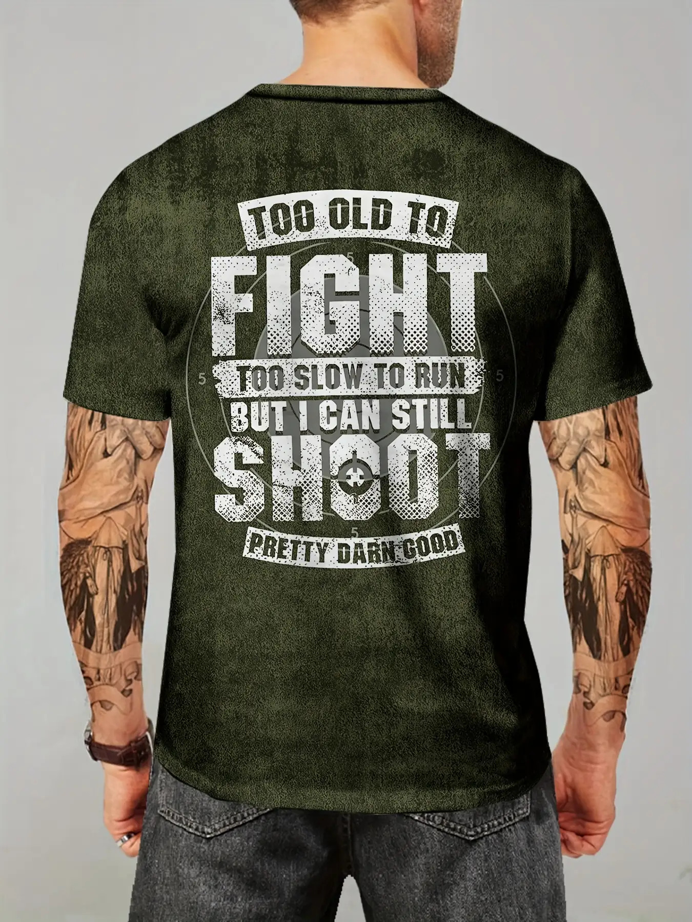 Men's Bold Graphic T-Shirt - Funny Shooting Sports Saying Back Print - Dark Olive Green Crew Neck Tee - Stretch Fabric Casual Shirt for Everyday & Weekend Outfits - Machine Washable Adult Sizes, Relaxed Style, Statement Design, Comfortable Fit, Short Sleeve Top, Humor Lovers, PLUS SIZE