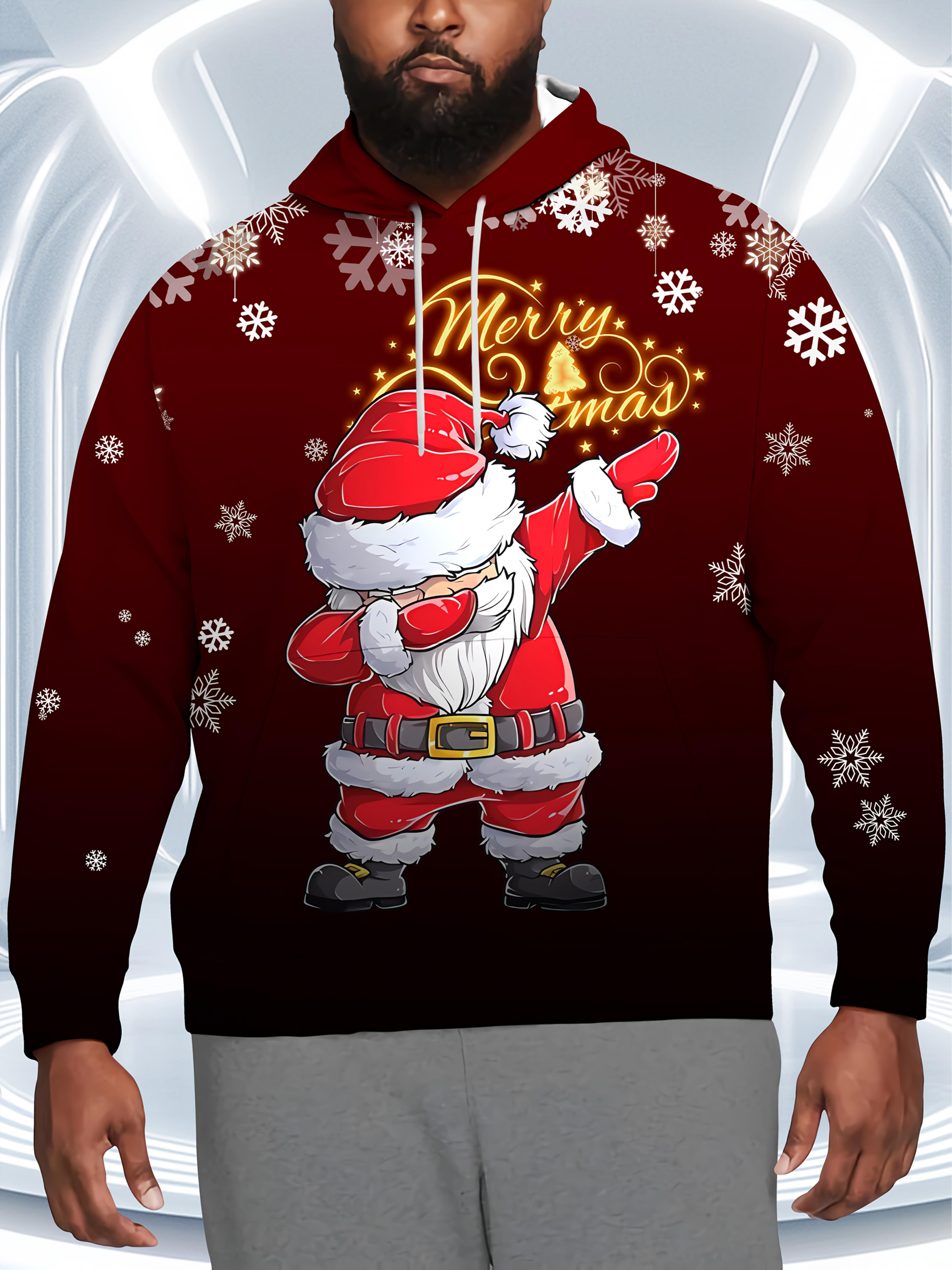 Men's Plus Size 3D Santa Claus & Snowflake Print Hooded Sweater - Oversized Red & Golden Christmas Pullover with 'Merry Christmas' Text, Loose Fit Long Sleeve Hoodie, Machine Washable Funny Ugly Christmas Party Outfit for Holiday Gatherings, PLUS SIZE