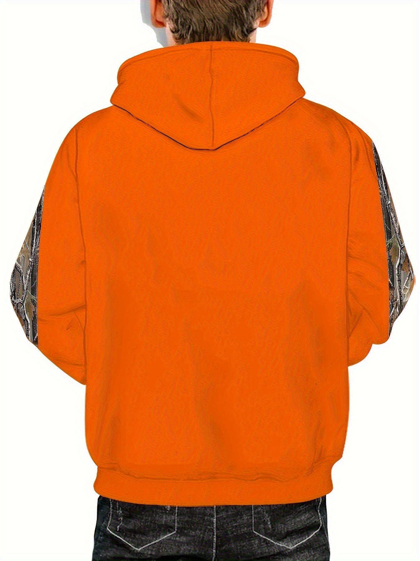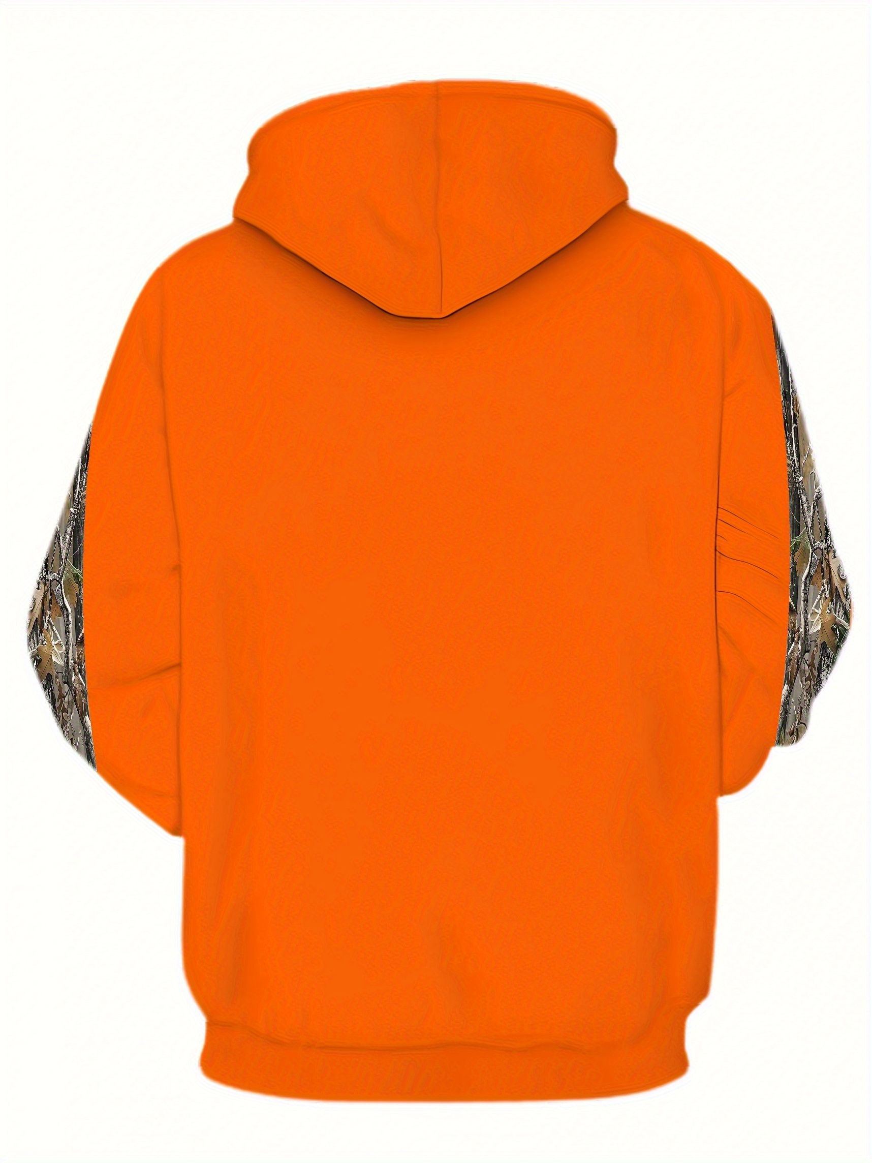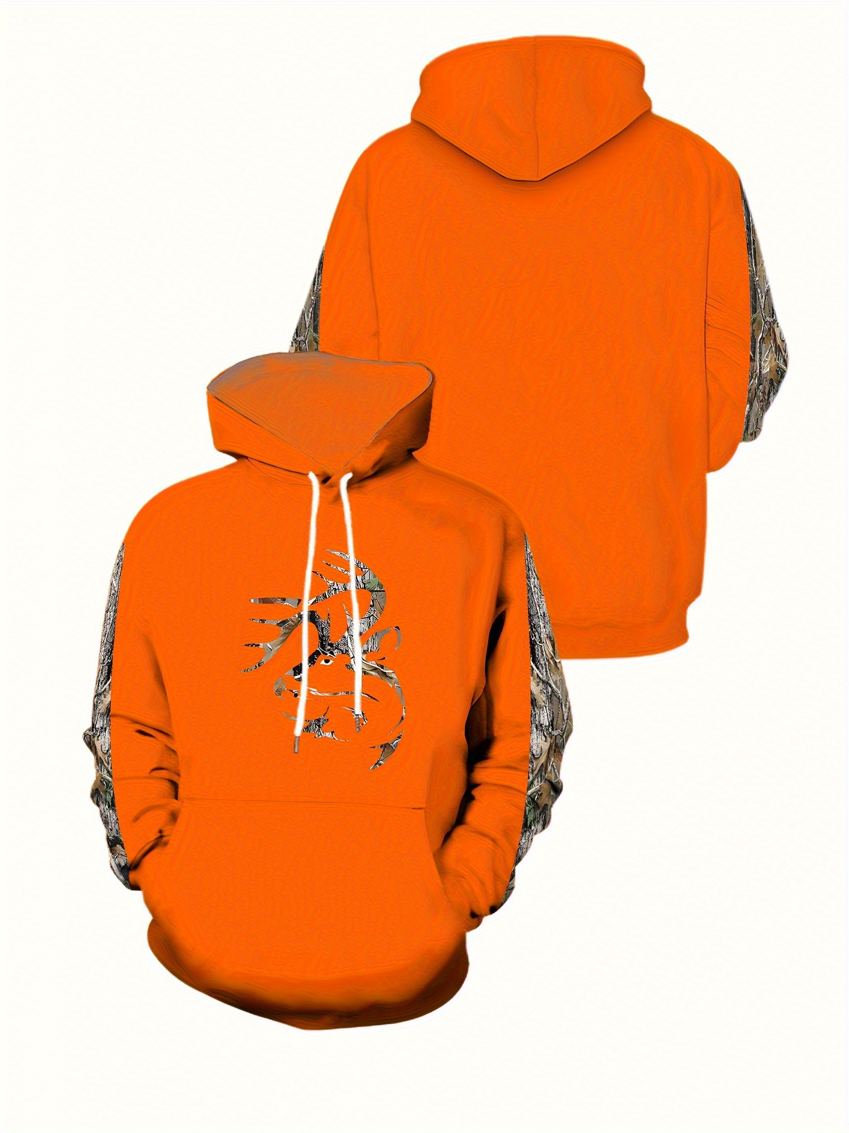 Men'S Plus Size Stretch Polyester Blend Hoodie - 3D Deer Pattern Bright Orange, Kangaroo Pocket Long Sleeve Pullover Suitable for Autumn and Winter, Machine Washable Casual Sportswear, Bold Animal Print, Comfortable Fit, Plus Size