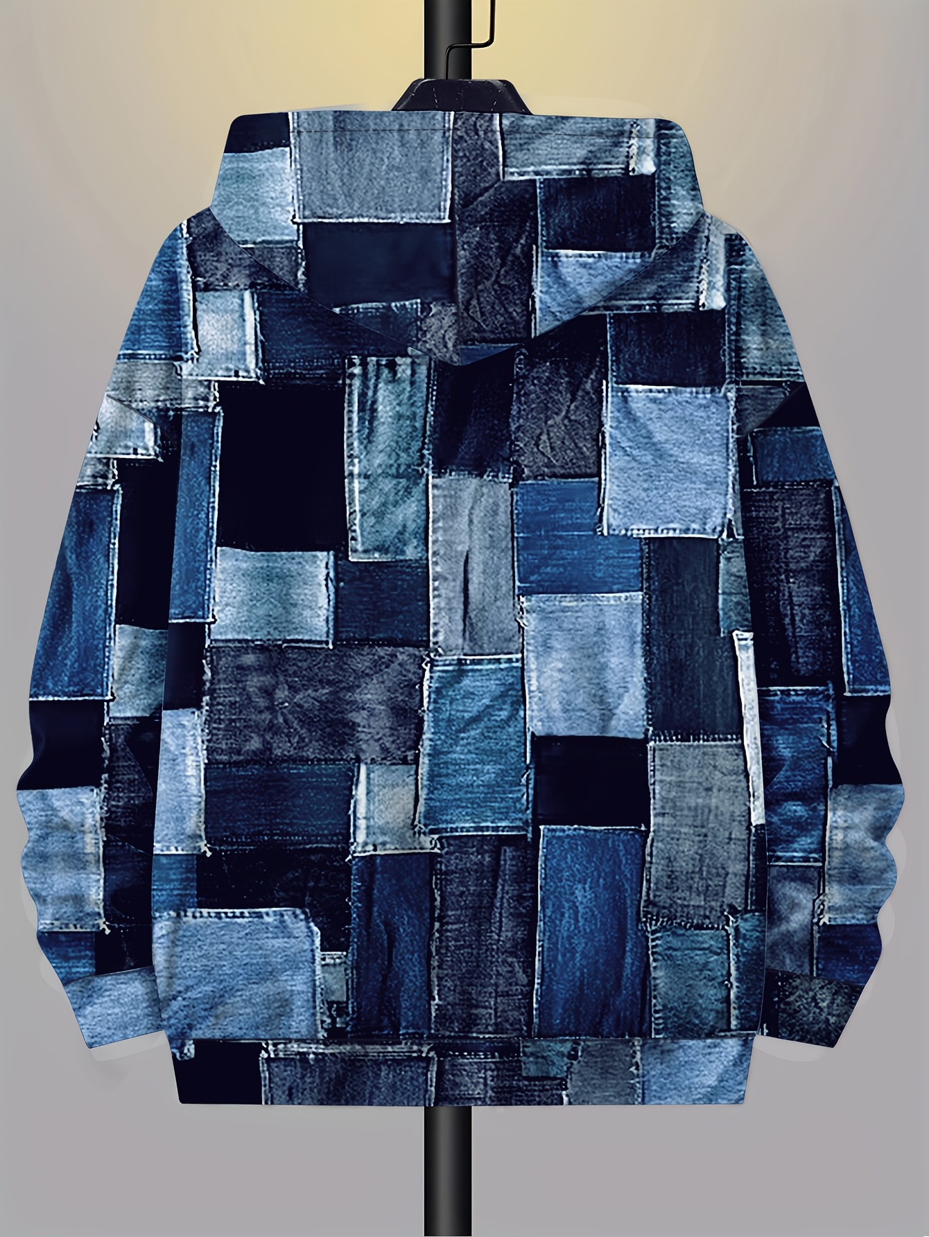 Plus Size Men's Full-Zip Hooded Cardigan Jacket - 3D Denim Patchwork Print (Blue/Denim) | Stretch Fabric | Casual Streetwear Coat with Zippered Hood & Pocket | Machine Washable Oversized Fit | Denim-Like Texture Outerwear, PLUS SIZE